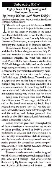 Walton covers in great and thorough detail all the obvious topics, from engineering aspects to driver profiles, as well as BMW's accomplishments in aviation and motorcycling. The text, in witty, conversational style, is accompanied by hundreds of well-captioned new and period photos. Six appendices cover competition cars since 1960, drivers' accomplishments, and powerplant specifications.