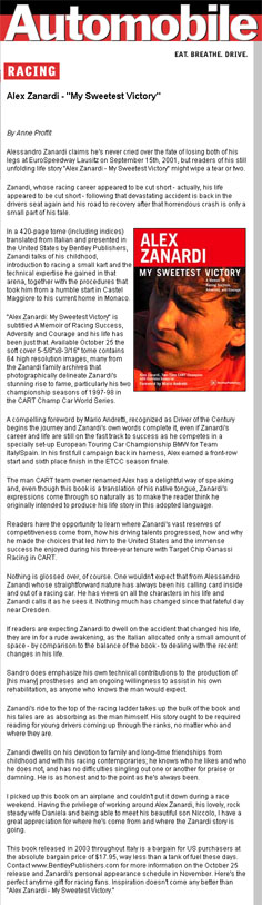 I picked up this book on an airplane and couldn't put it down during a race weekend. Having the privilege of working around Alex Zanardi, his lovely, rock steady wife Daniela and being able to meet his beautiful son Niccolo, I have a great appreciation for where he's come from and where the Zanardi story is going.