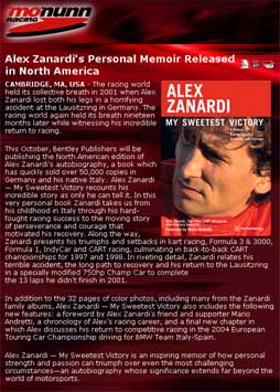 This October, Bentley Publishers will be publishing the North American edition of Alex Zanardi’s autobiography, a book which has quickly sold over 50,000 copies in Germany and his native Italy. Alex Zanardi - My Sweetest Victory recounts his incredible story as only he can tell it. In this very personal book Zanardi takes us from his childhood in Italy through his hard-fought racing success to the moving story of perseverance and courage that motivated his recovery. Along the way, Zanardi presents his triumphs and setbacks in kart racing, Formula 3 & 3000, Formula 1, IndyCar and CART racing, culminating in back-to-back CART championships for 1997 and 1998. In riveting detail, Zanardi relates his terrible accident, the long path to recovery and his return to the Lausitzring in a specially modified 750hp Champ Car to complete the 13 laps he didn’t finish in 2001.